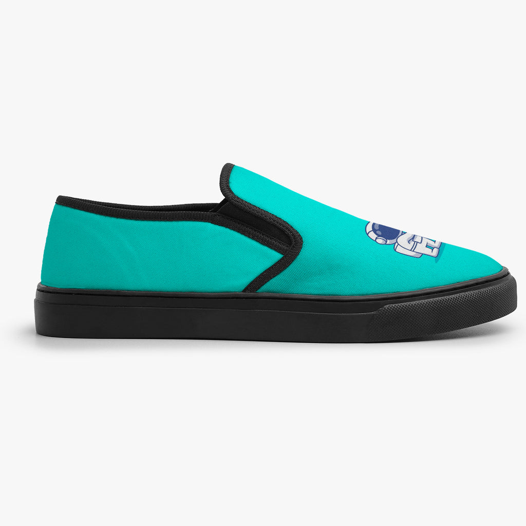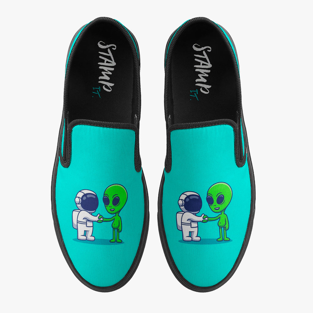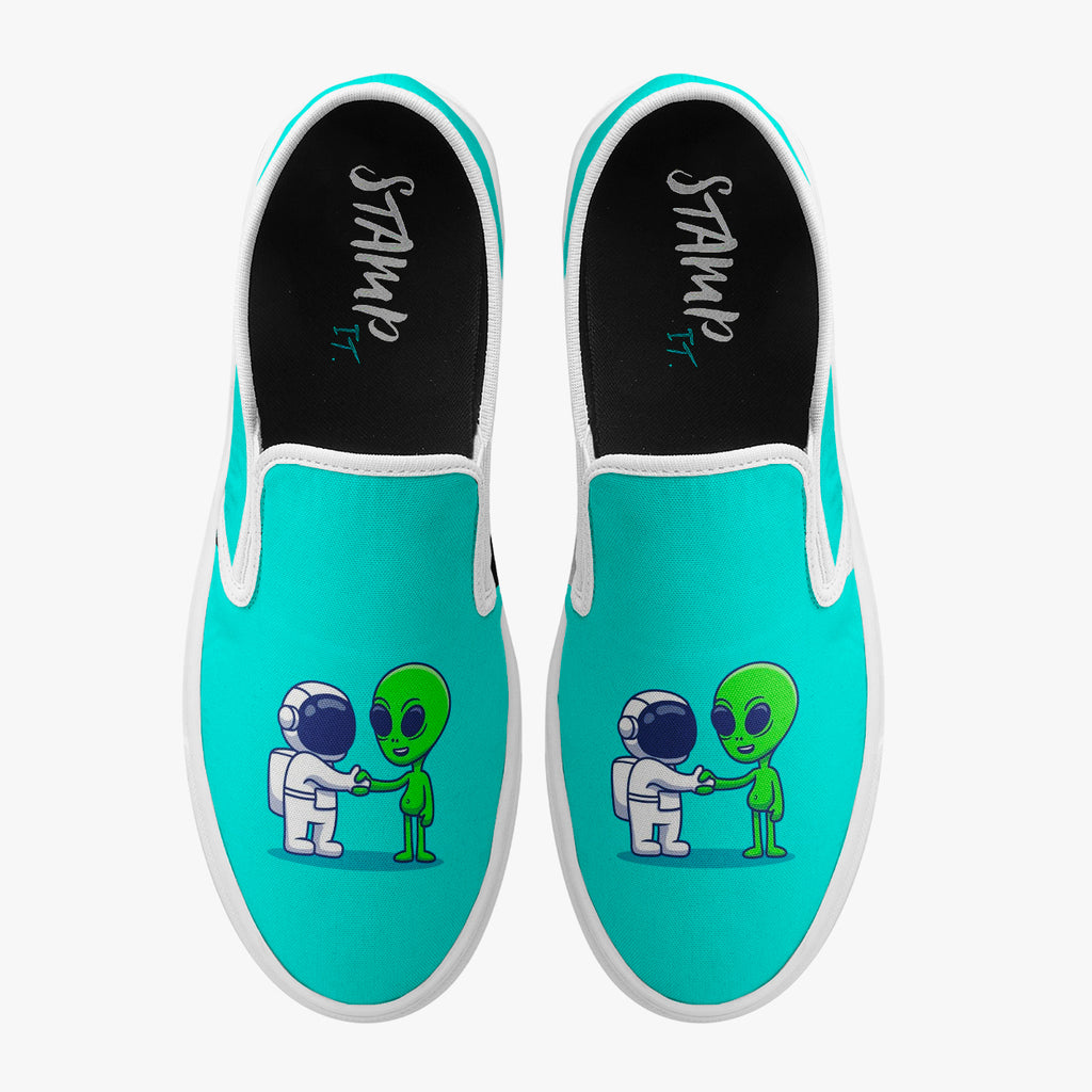 Tênis Slip On Azul Verde Amizade Extraterrestre Abstrato, confeccionado em lona, com cores e estampas exclusivas.