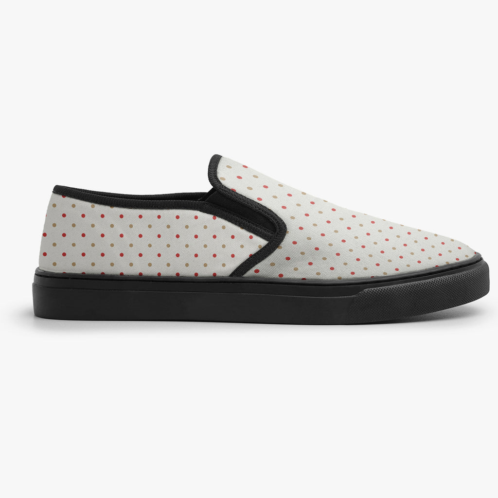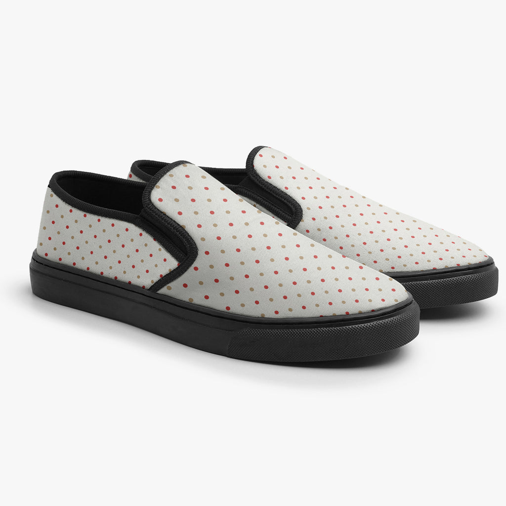 Calçado Slip On Branco Bolinhas Coloridas Anos 60 Retrô Abstrato, confeccionado em lona, com cores e estampas exclusivas.