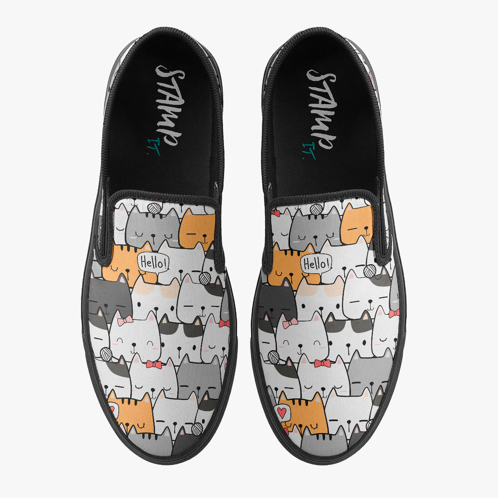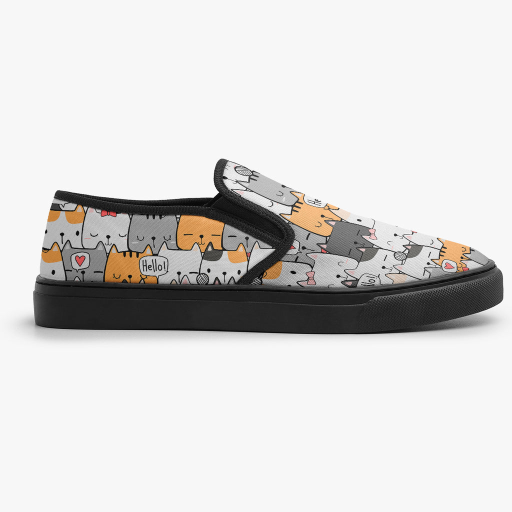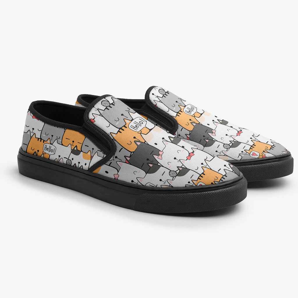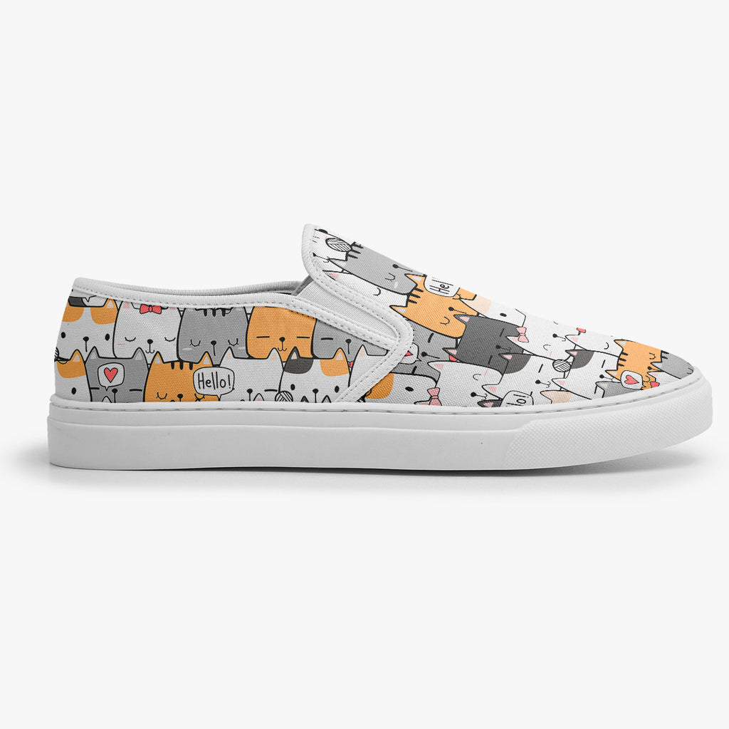 Tênis Slip On Branco Gatinhos Hello Animais, confeccionado em lona, com cores e estampas exclusivas.