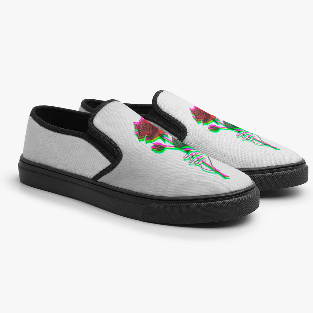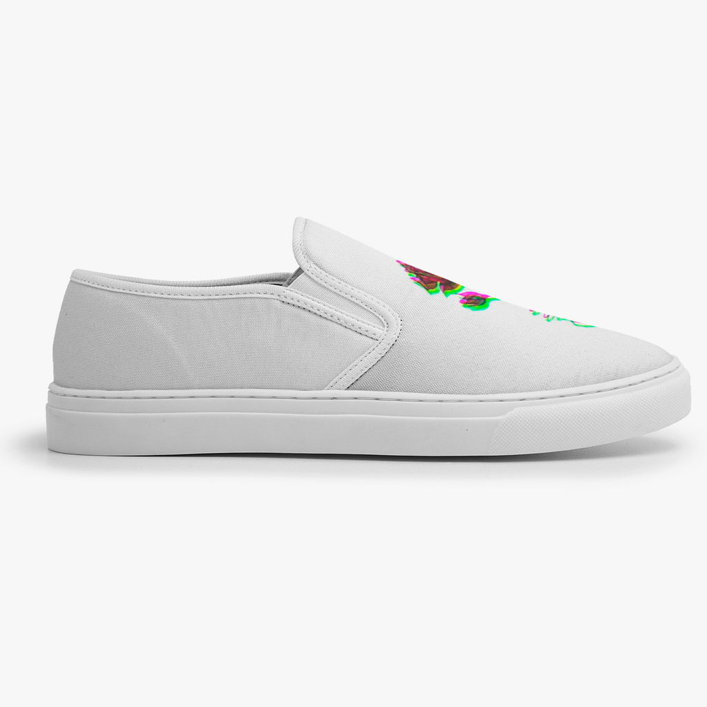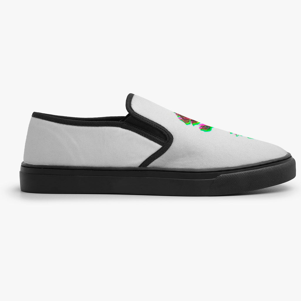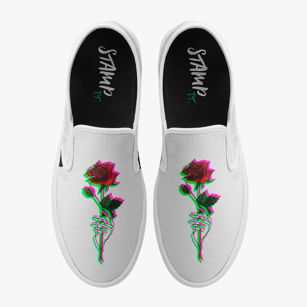 Calçado Slip On Branco Rosa Vermelha Indie Tumblr Flores e Folhas, confeccionado em lona, com cores e estampas exclusivas.