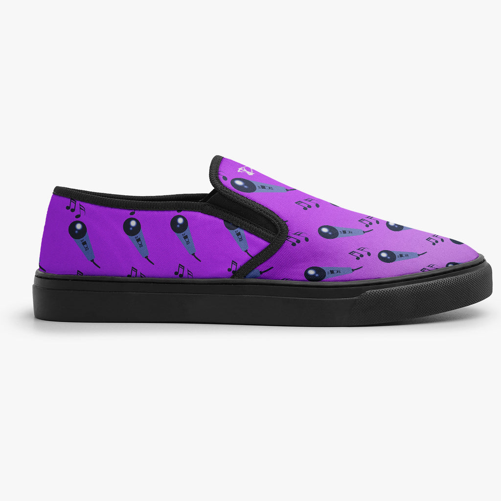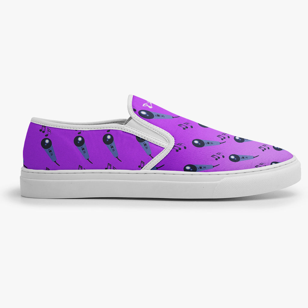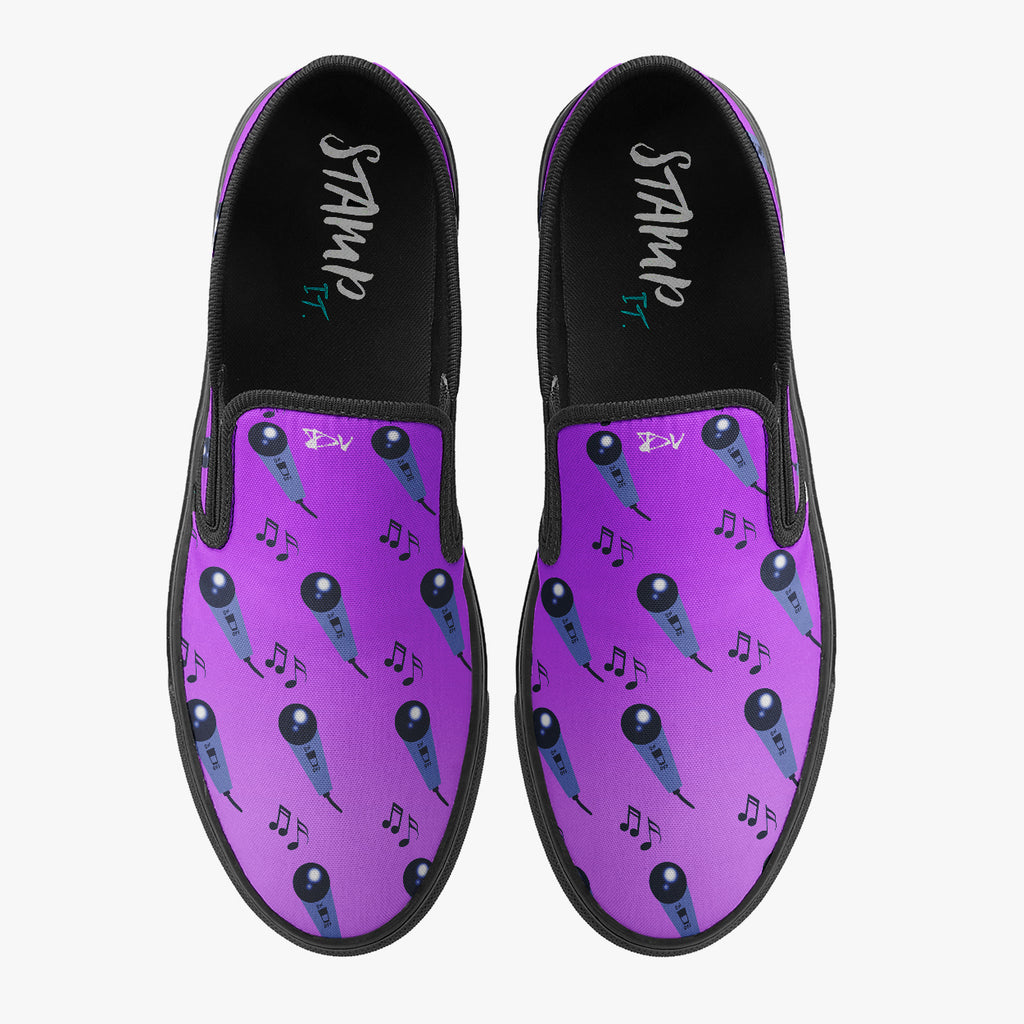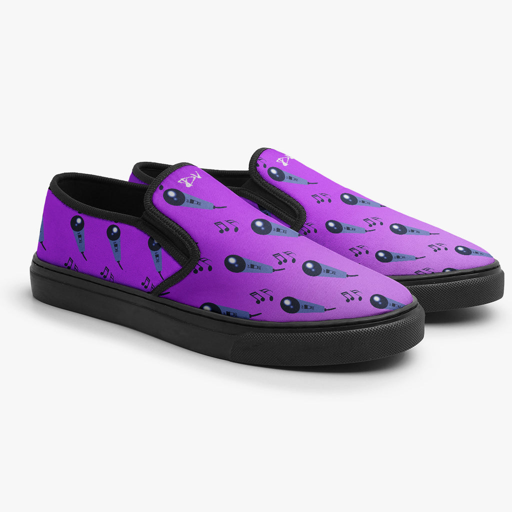 Calçado Slip On Microfone Música Roxo Dudu Varello Cultura e Arte, confeccionado em lona, com cores e estampas exclusivas.
