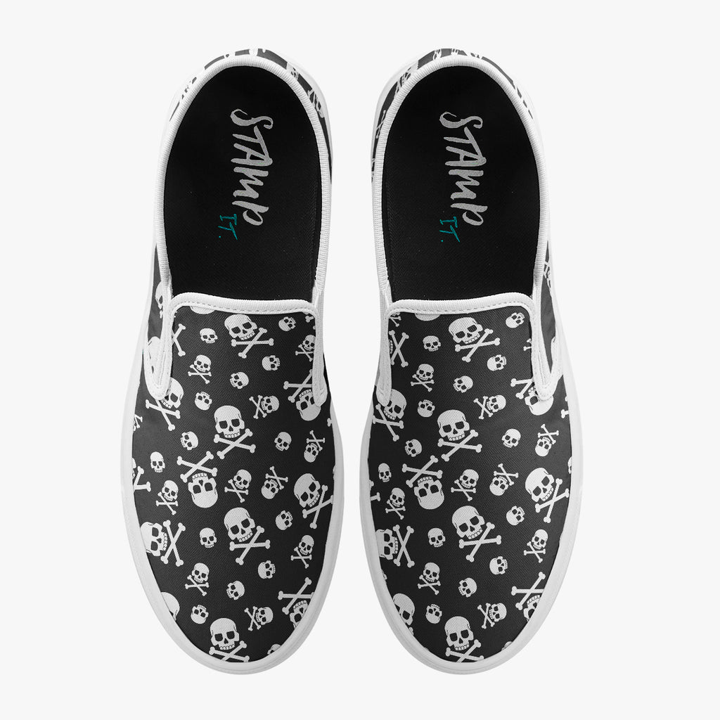 Tênis Slip On Preto Caveiras e Ossos Brancos Caveiras, confeccionado em lona, com cores e estampas exclusivas.