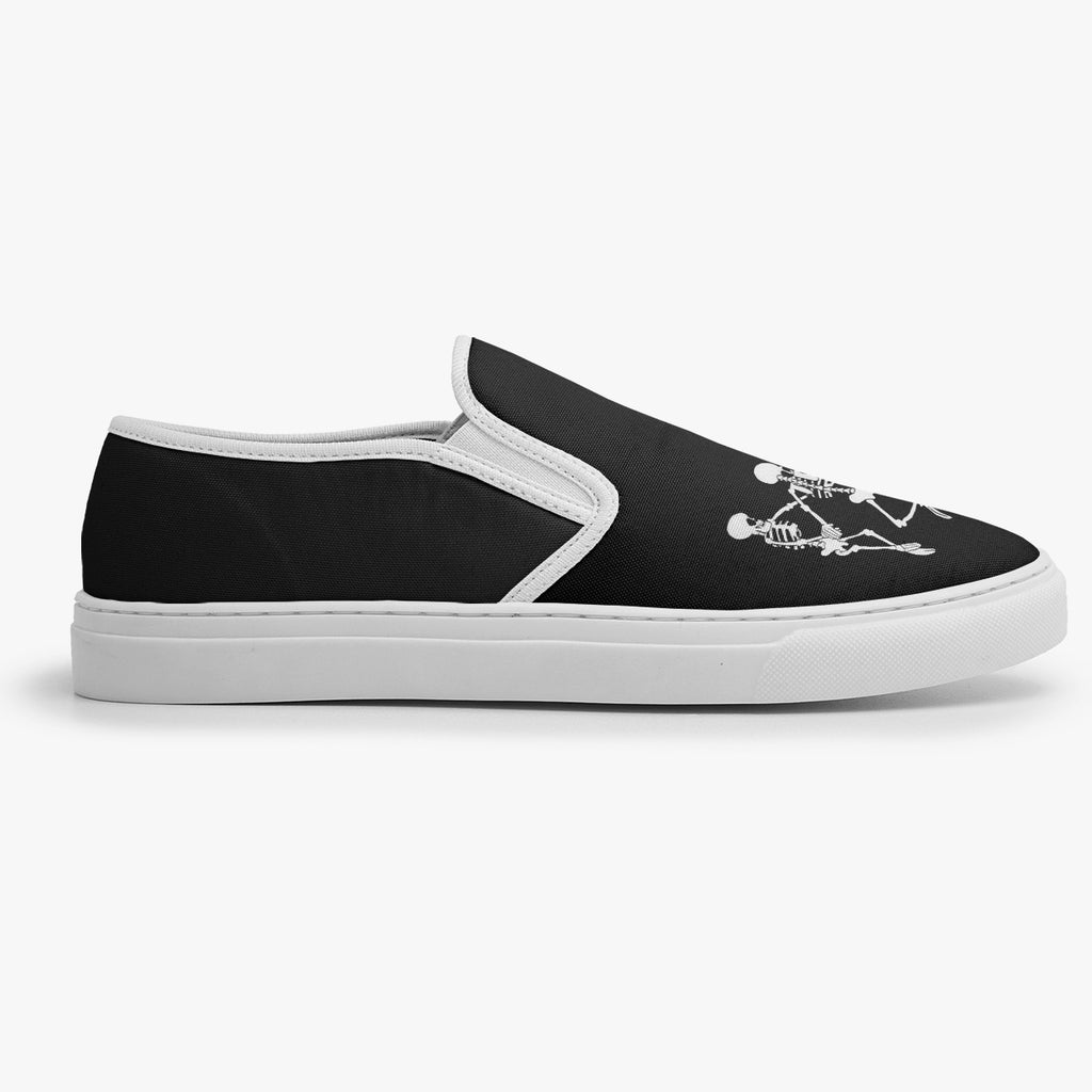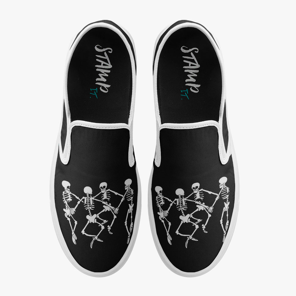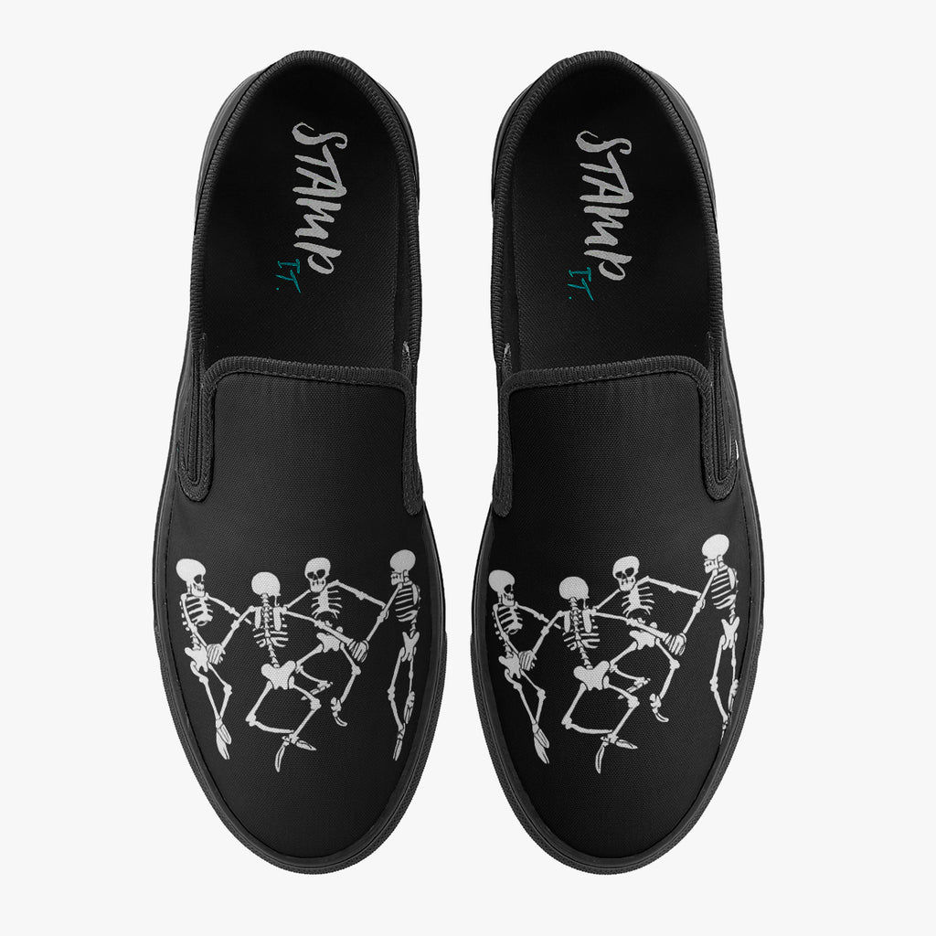 Tênis Slip On Preto Ciranda Roda de Caveiras, confeccionado em lona, com cores e estampas exclusivas.