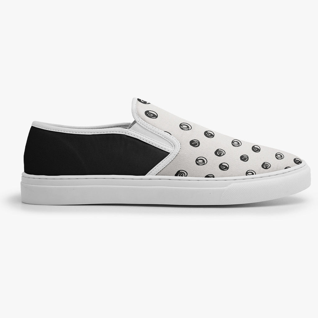 Tênis Slip On Preto e Branco Bolinhas Riscadas Abstrato, confeccionado em lona, com cores e estampas exclusivas.
