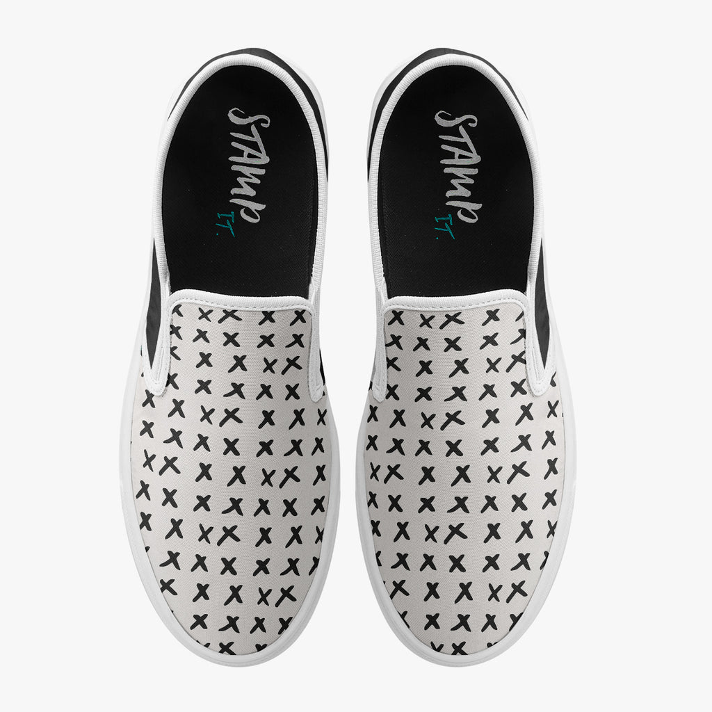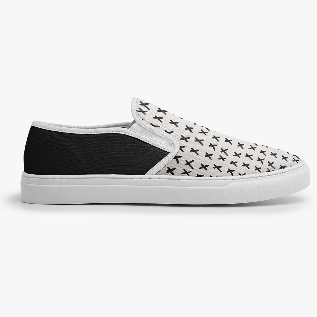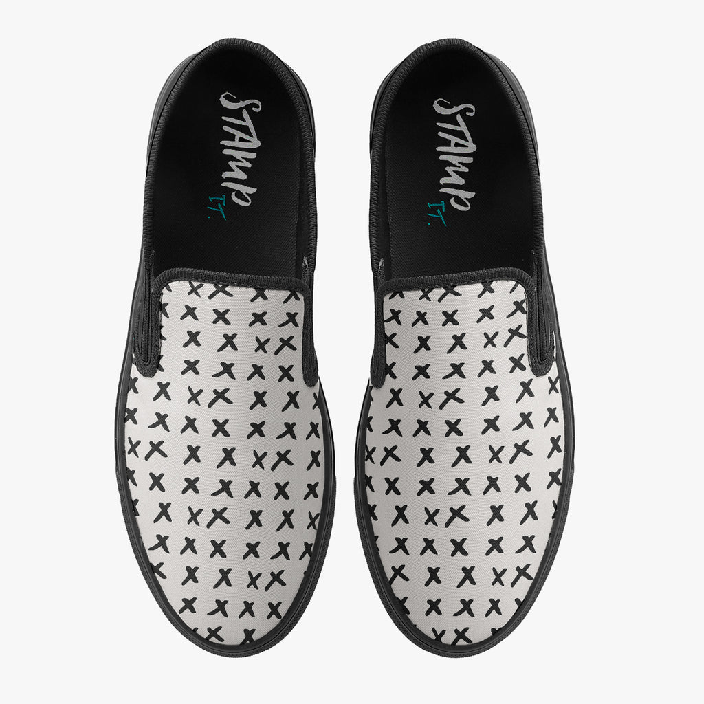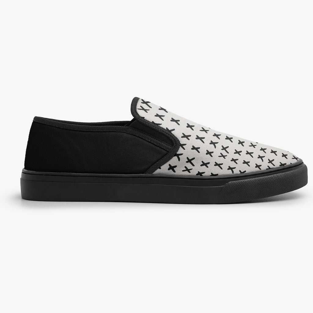 Tênis Slip On Preto e Branco em X Rabiscado Abstrato, confeccionado em lona, com cores e estampas exclusivas.
