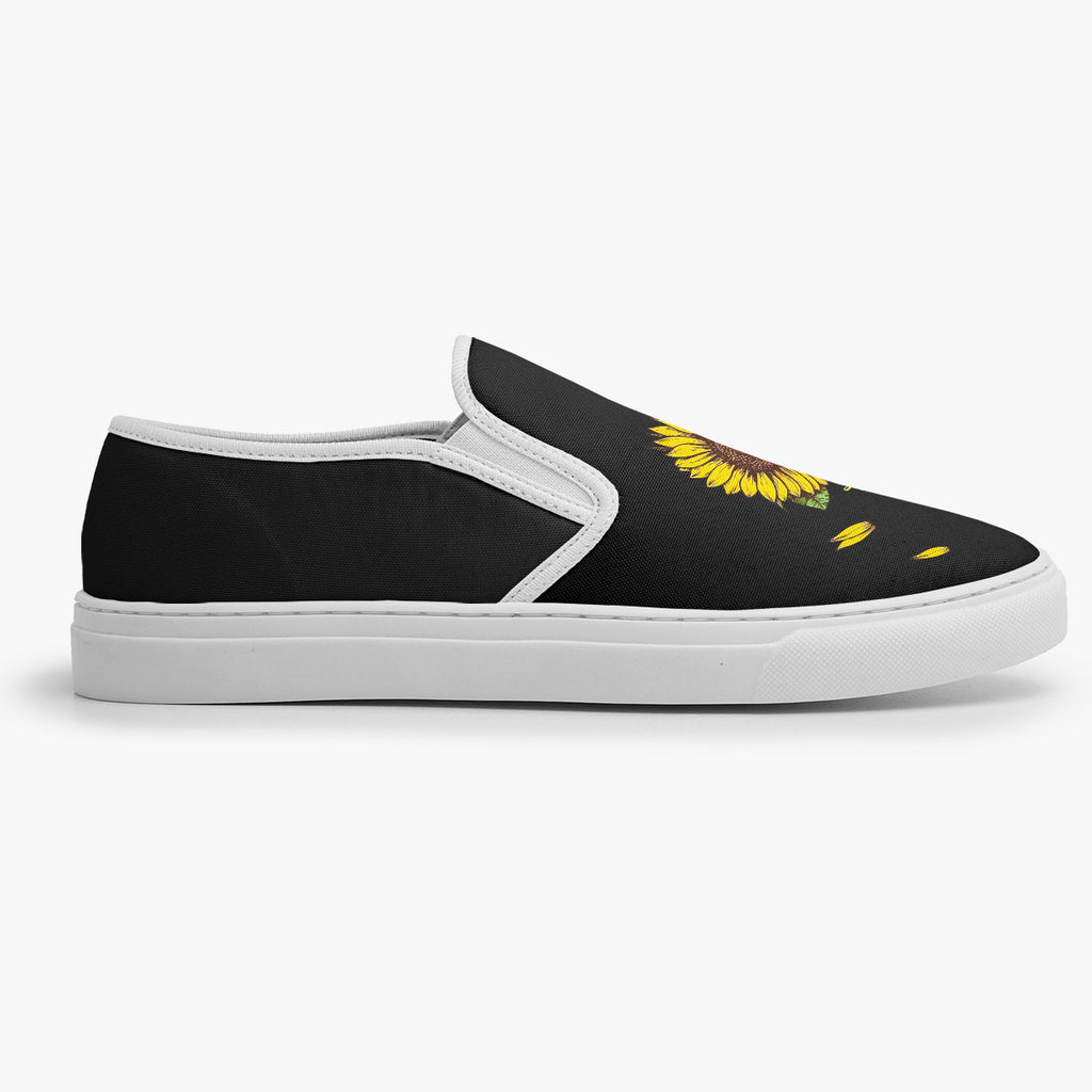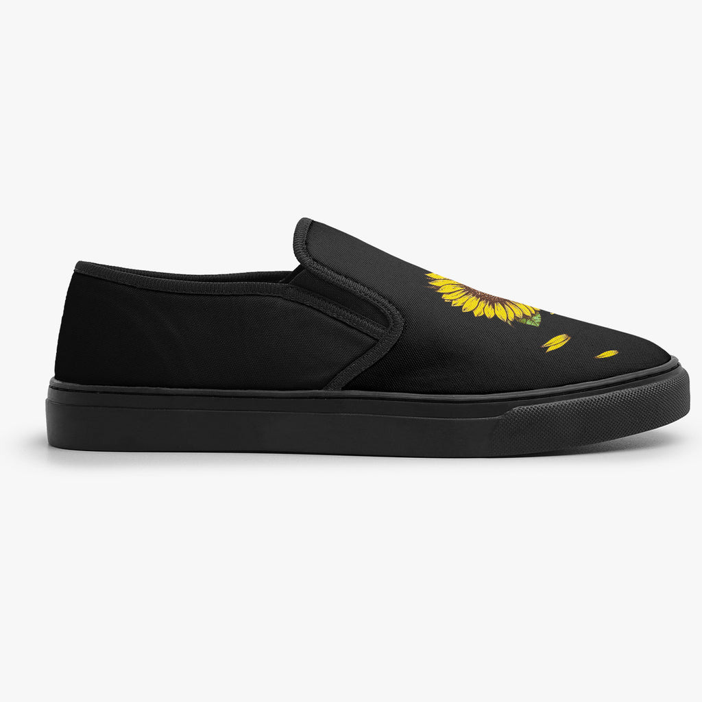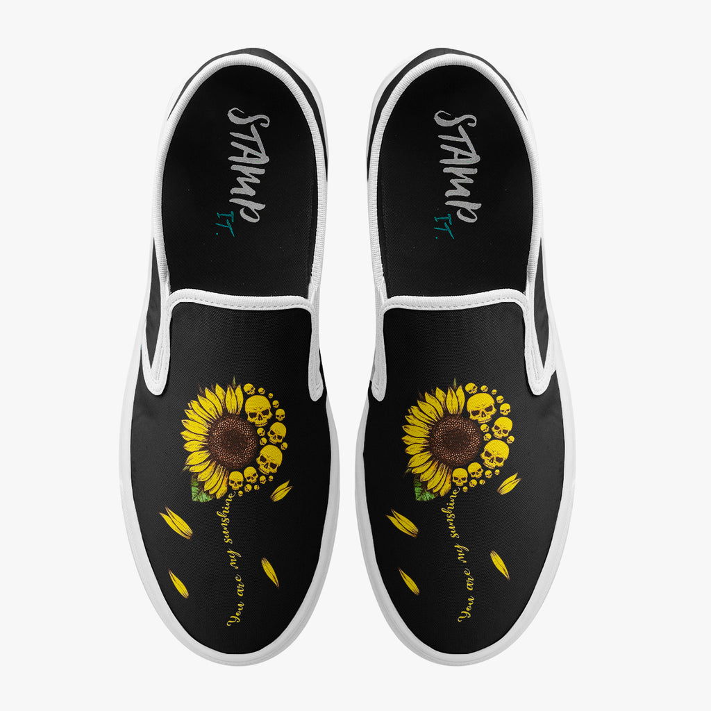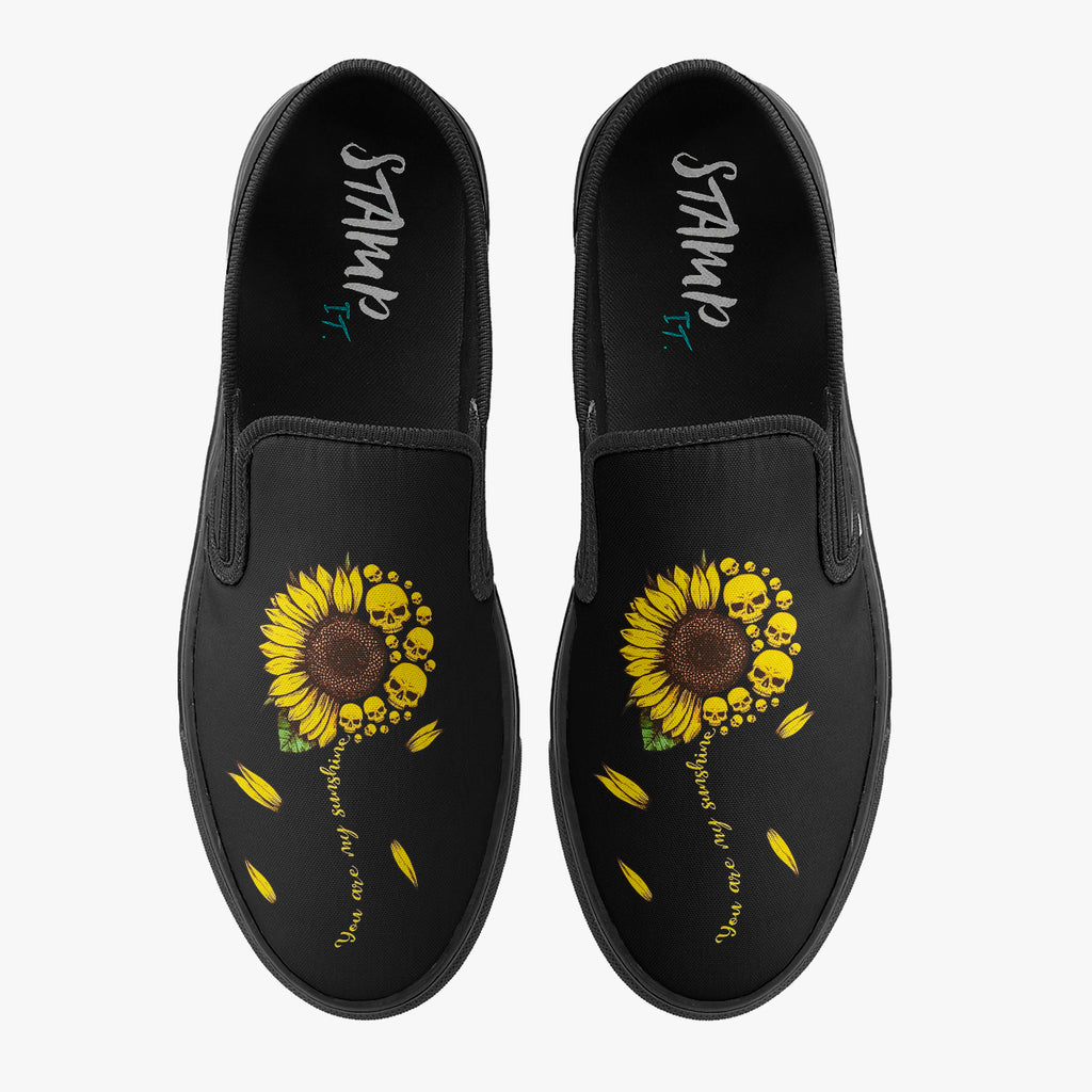 Tênis Slip On Preto Girassol Caveiras Amarelas Abstrato