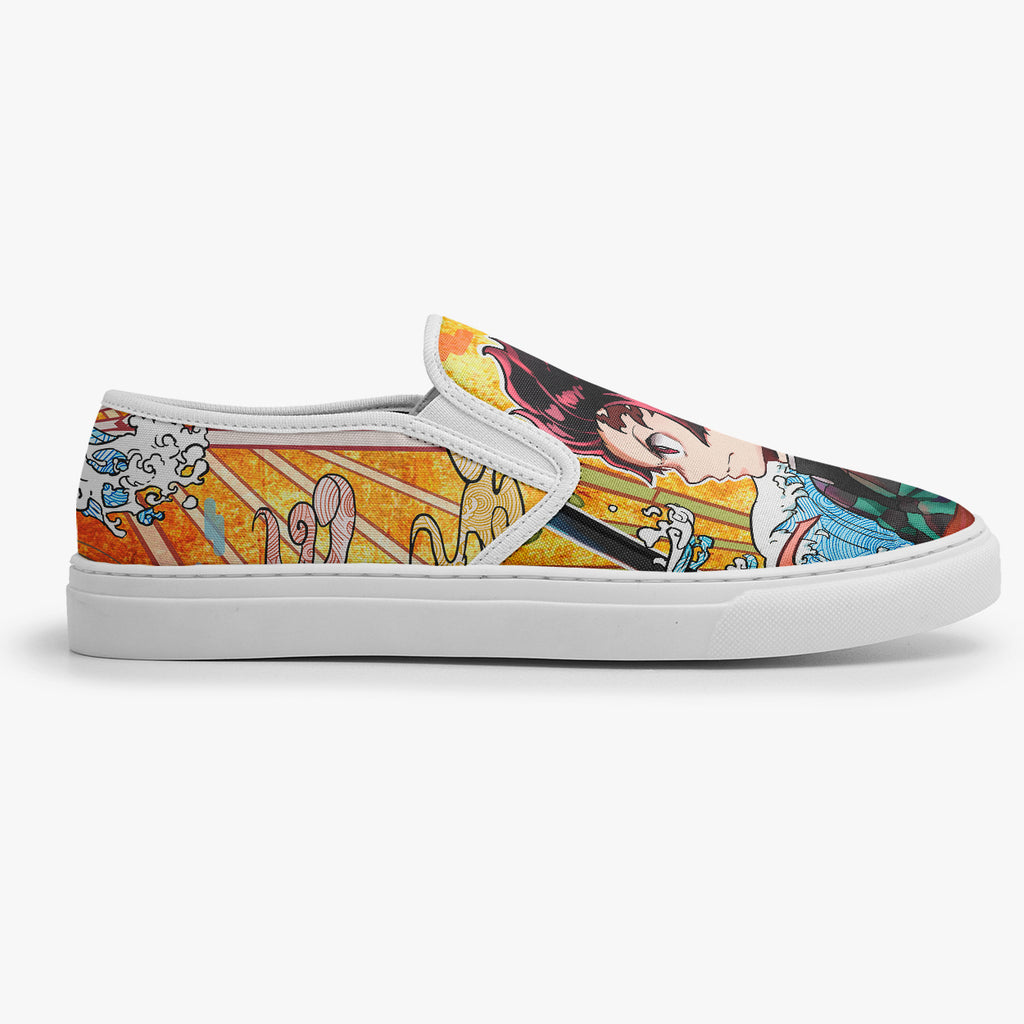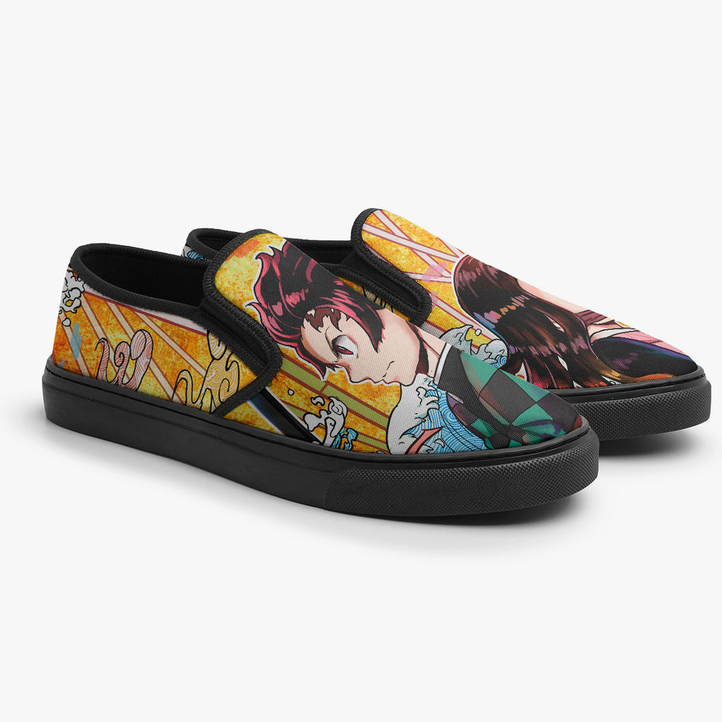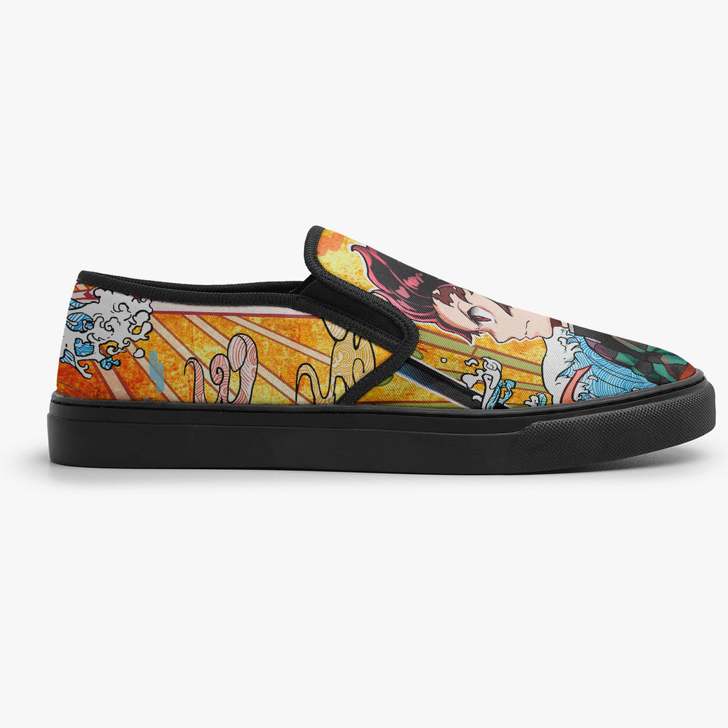 Calçado Slip On Preto Otaku Demon Kimetsu No Yaiba Anime, confeccionado em lona, com cores e estampas exclusivas.