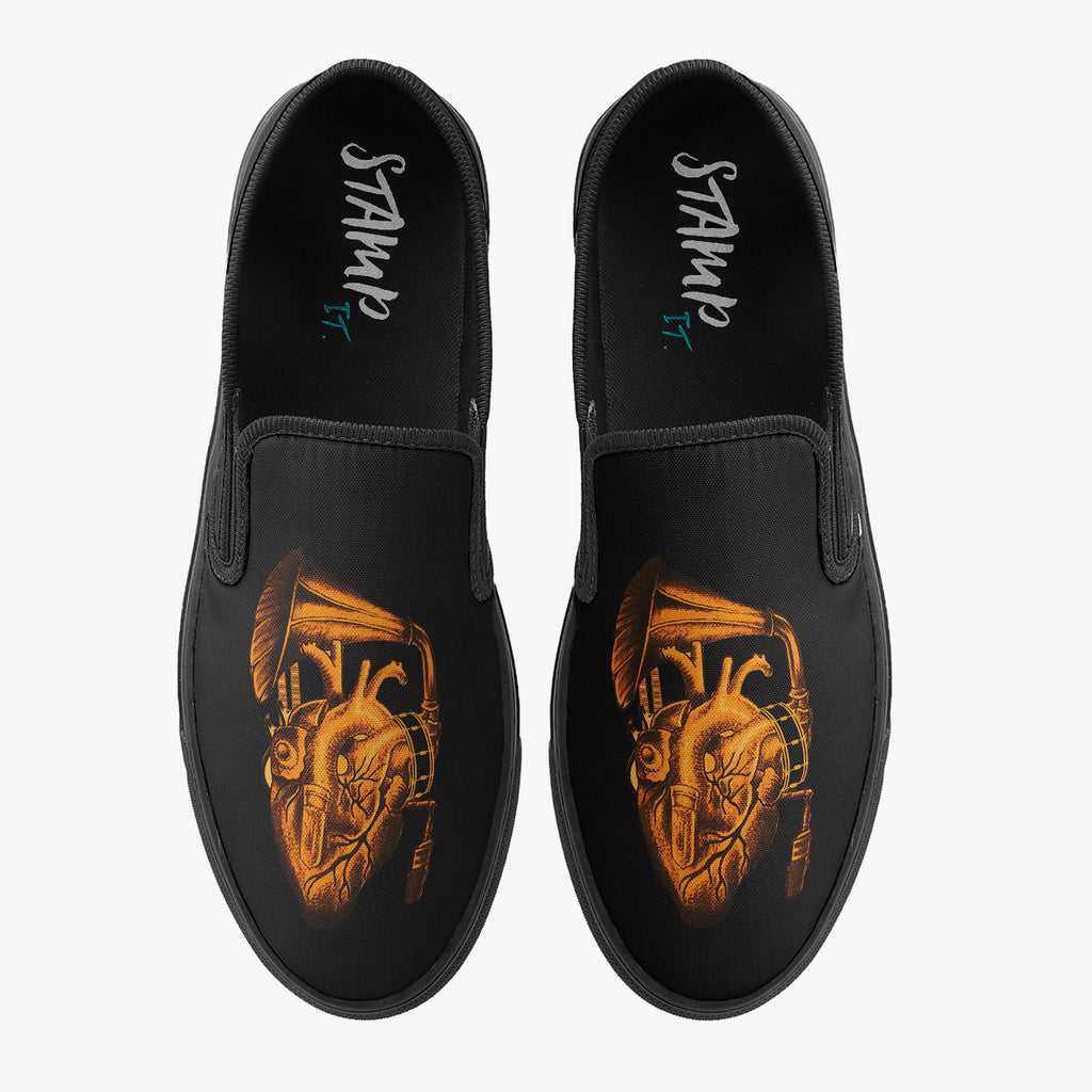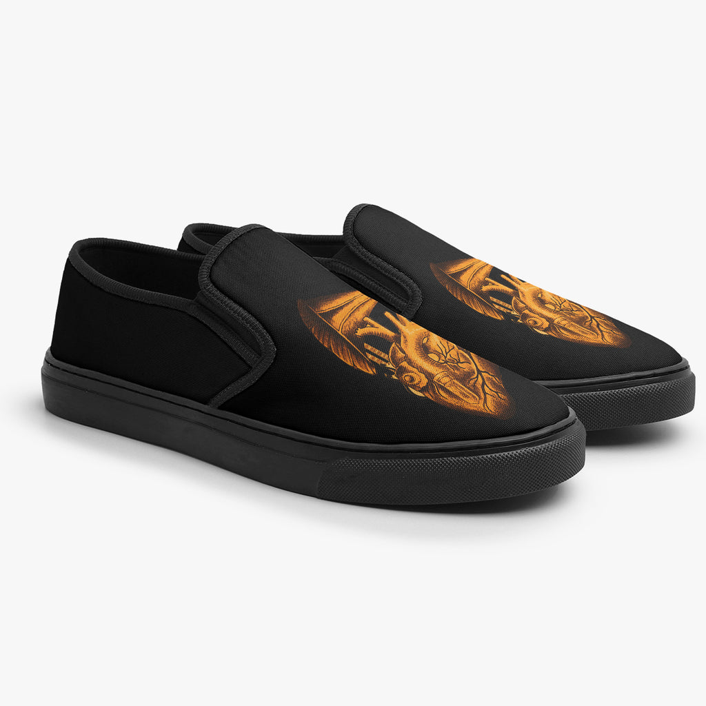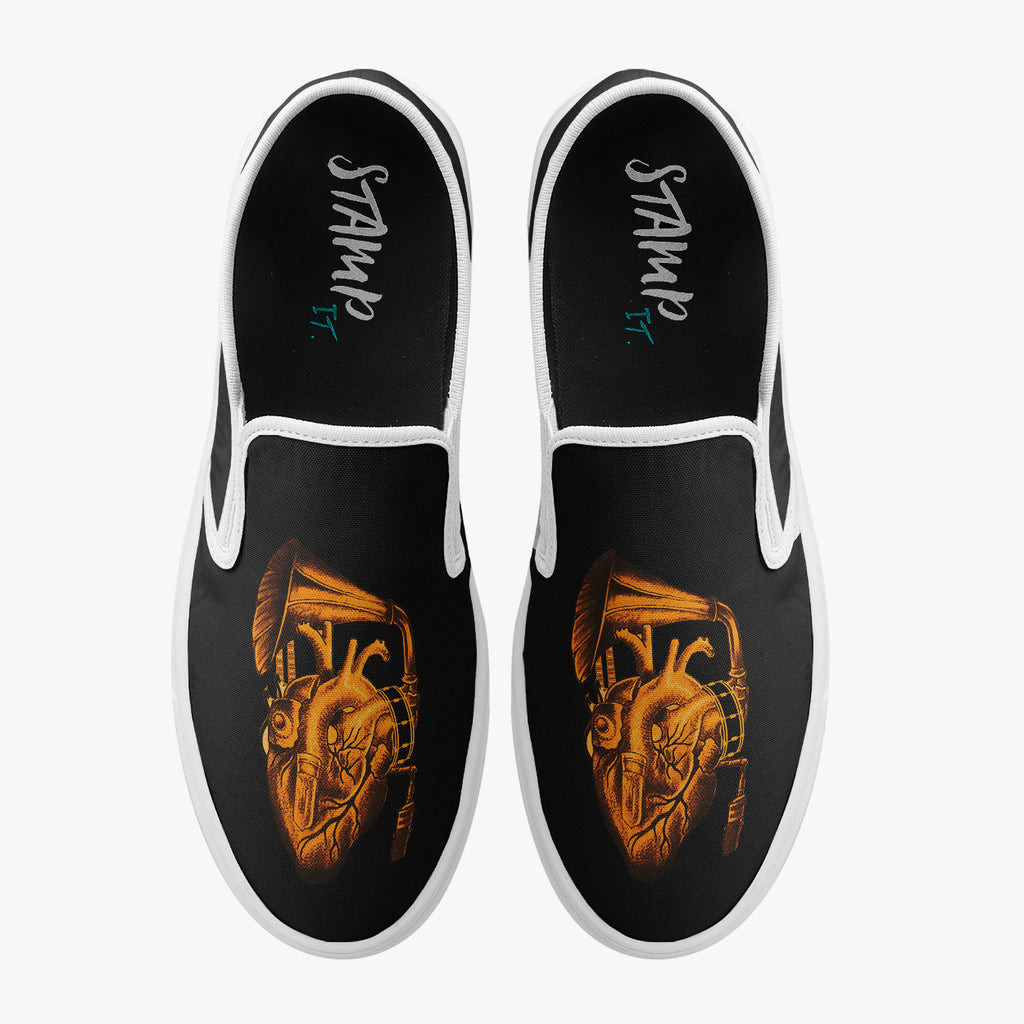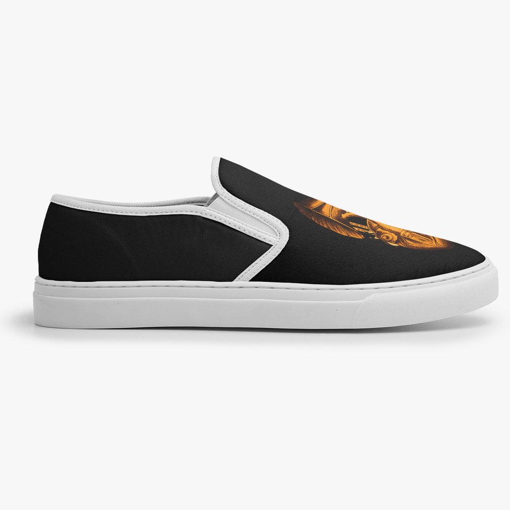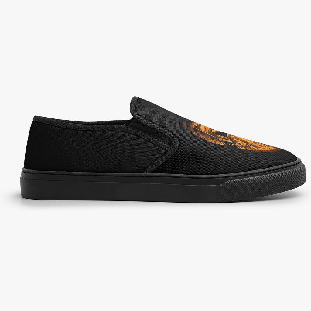 Tênis Slip On Preto Rootsans , confeccionado em lona, com cores e estampas exclusivas.