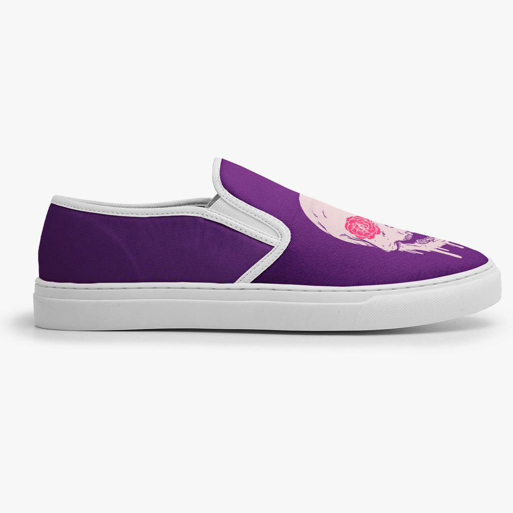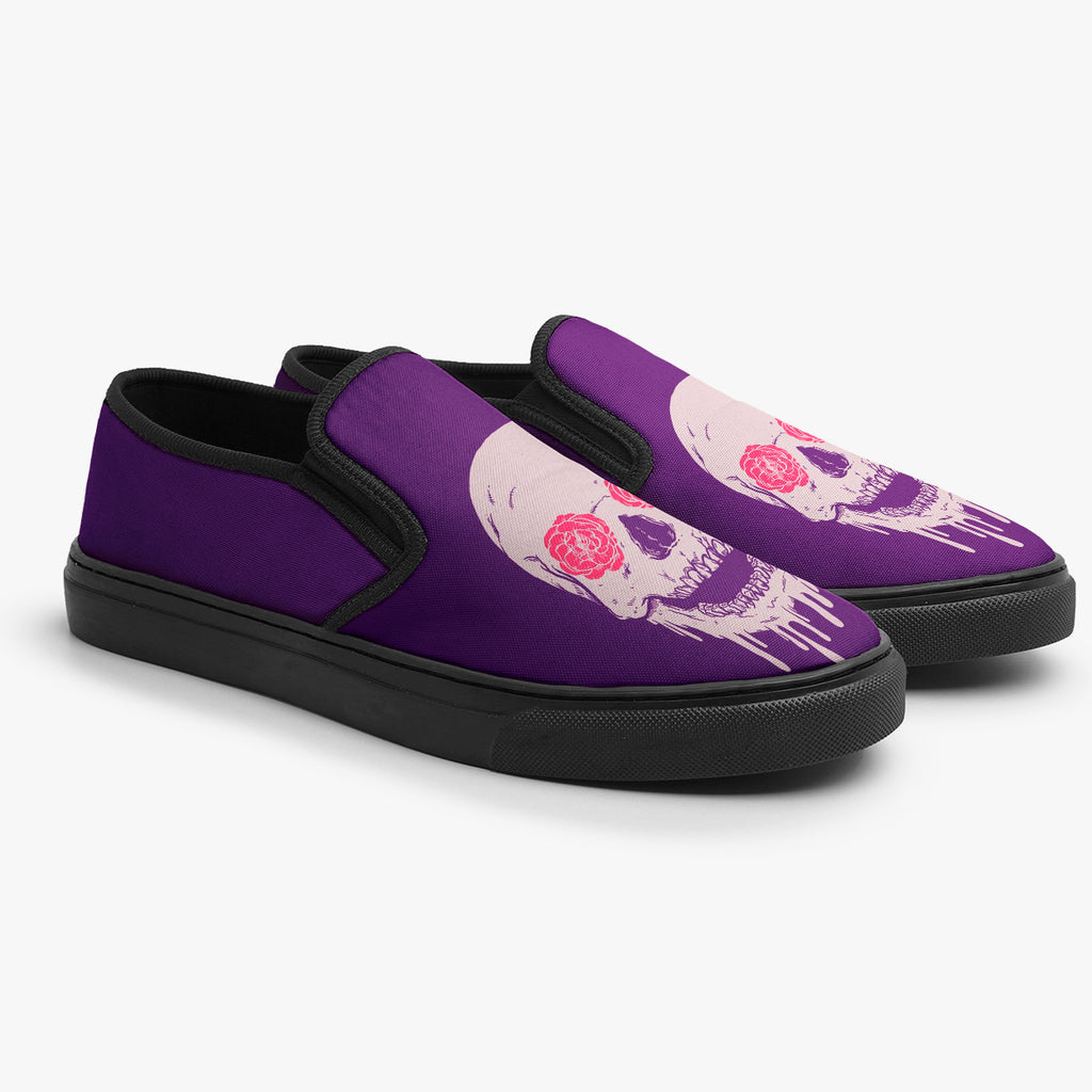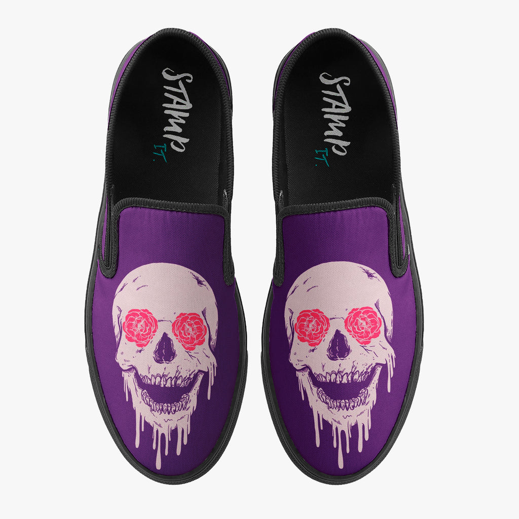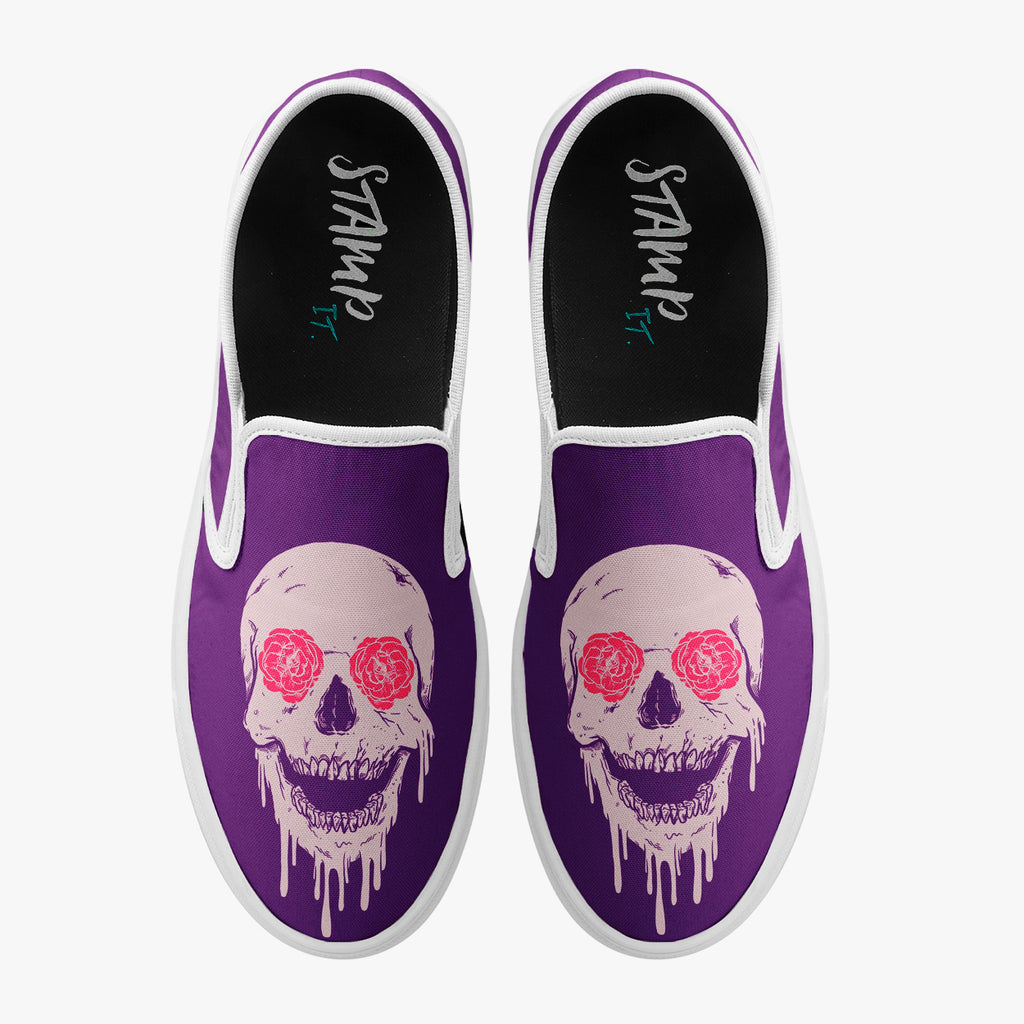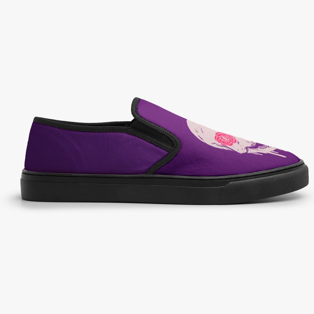 Tênis Slip On Roxo Crânio Com Rosa Nos Olhos Caveiras, confeccionado em lona, com cores e estampas exclusivas.