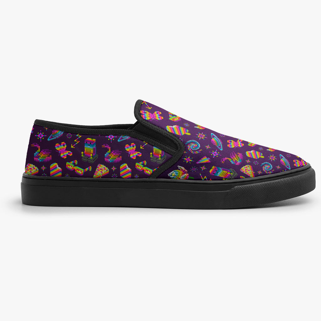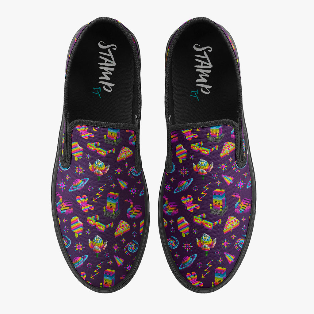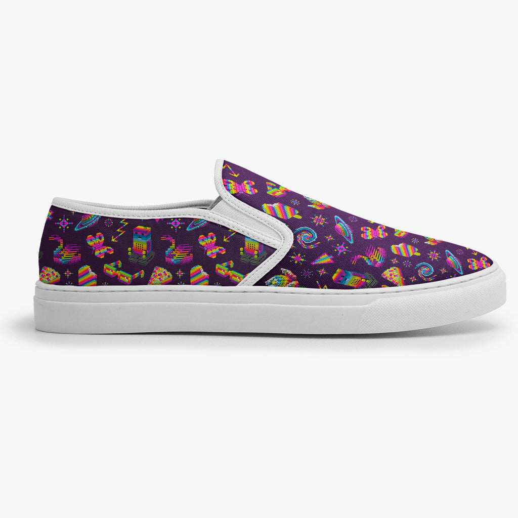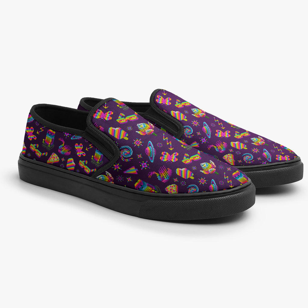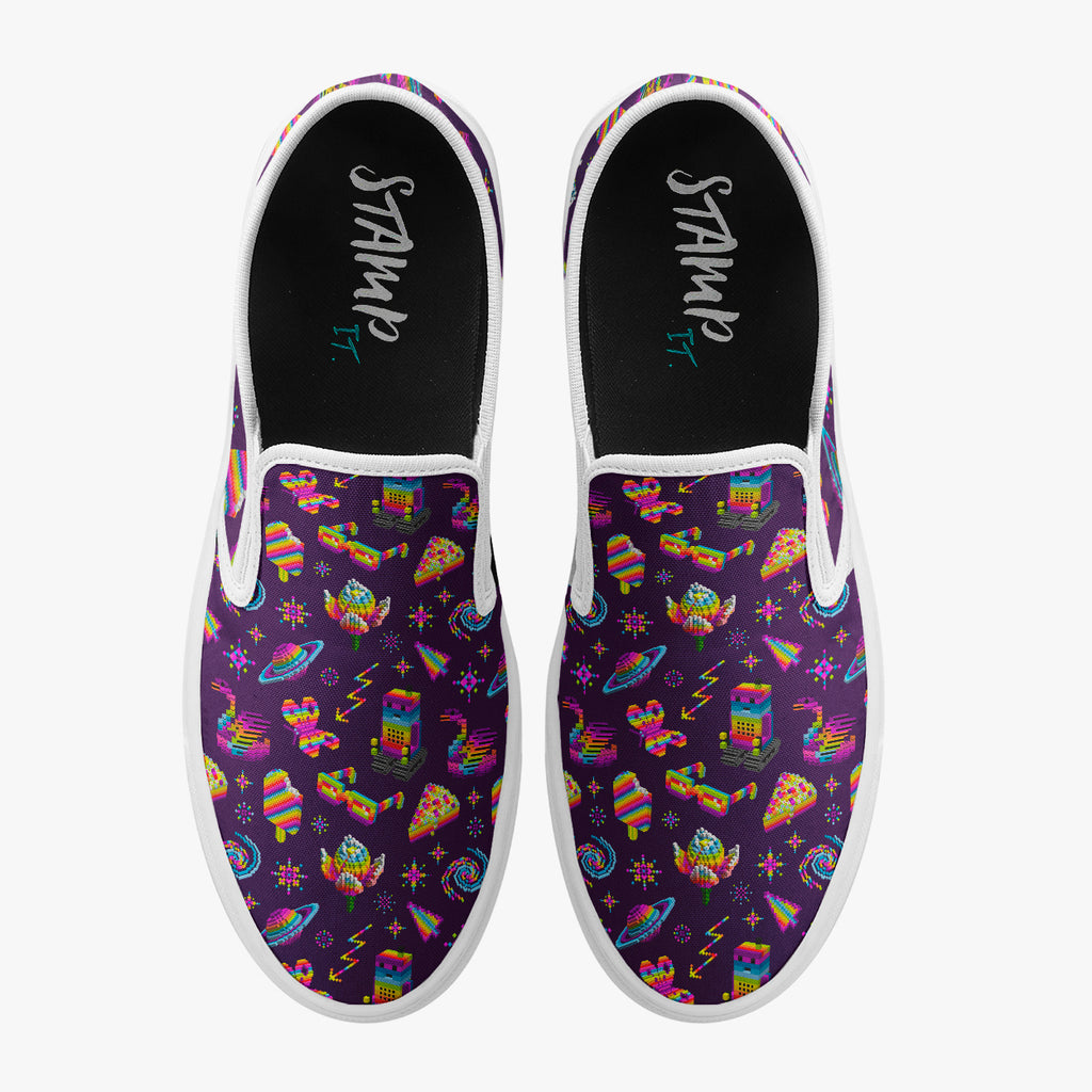 Calçado Slip On Roxo Cute Psicodélico Desenhos Tumblr Abstrato, confeccionado em lona, com cores e estampas exclusivas.