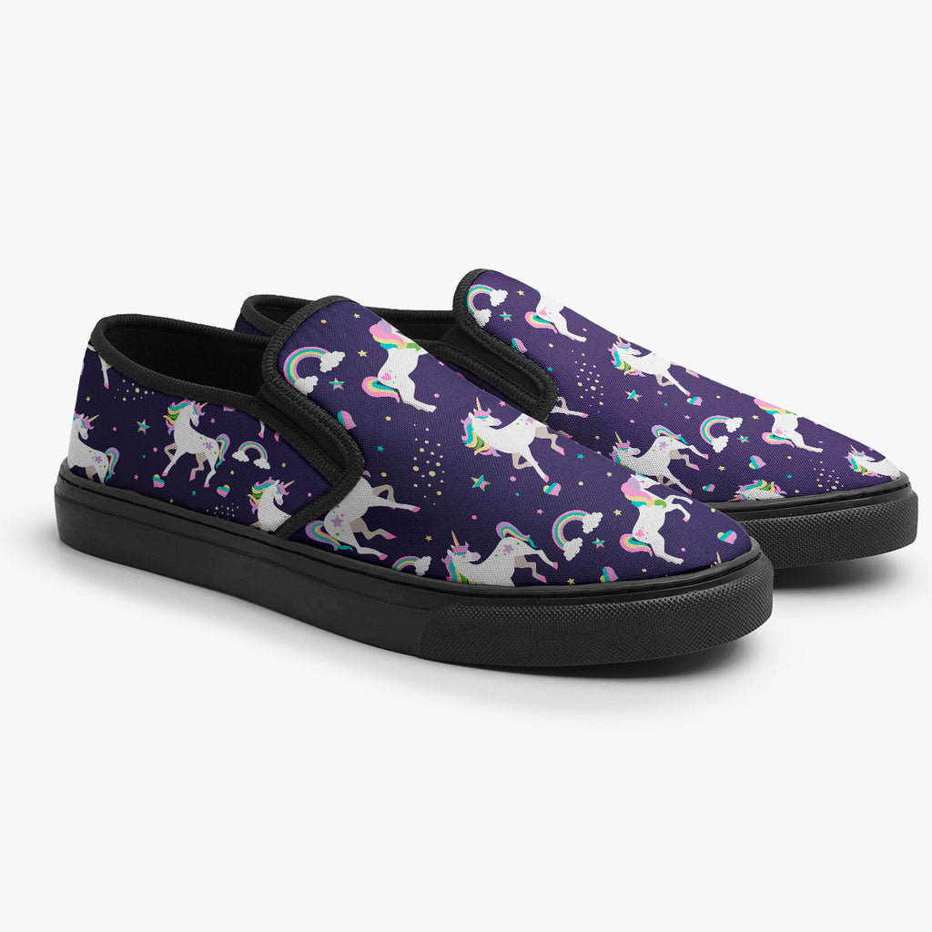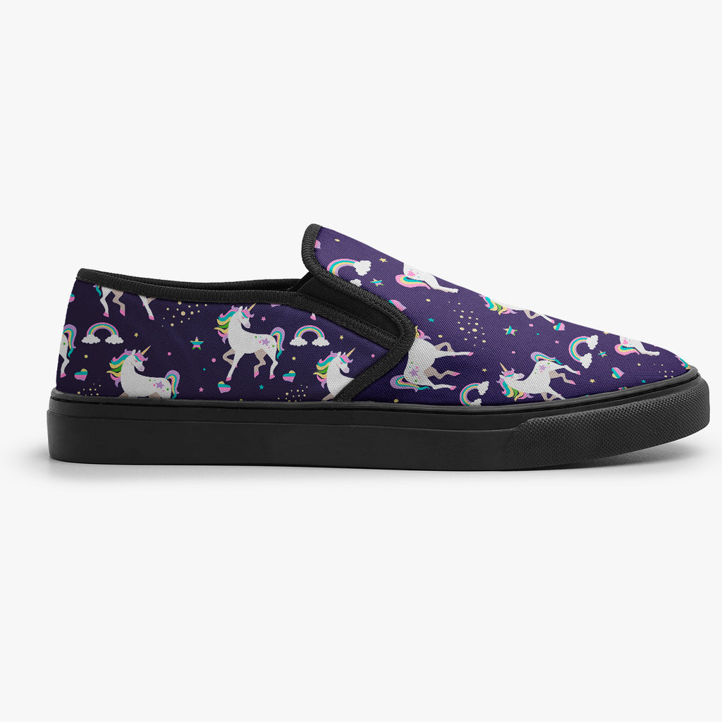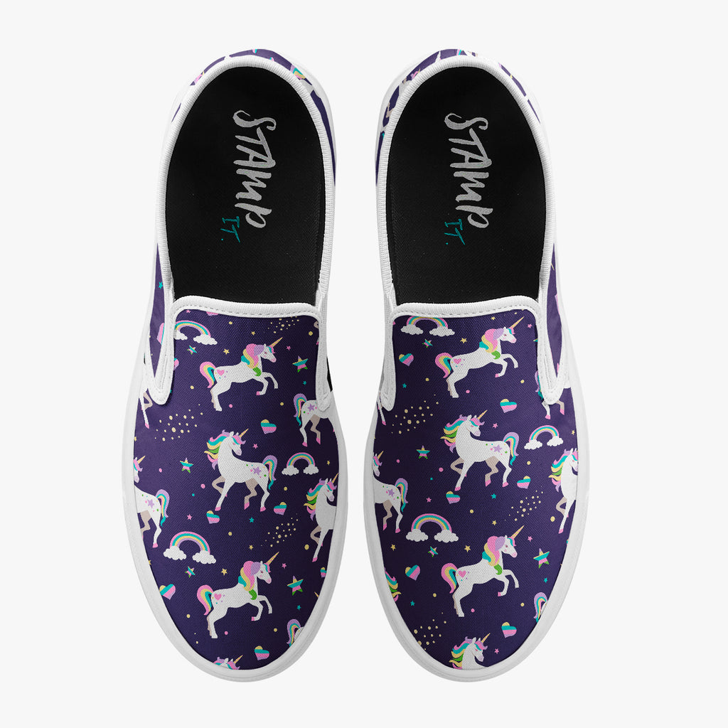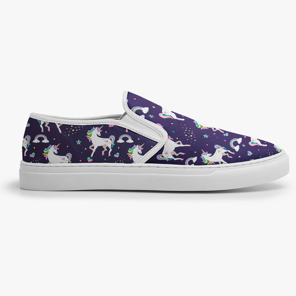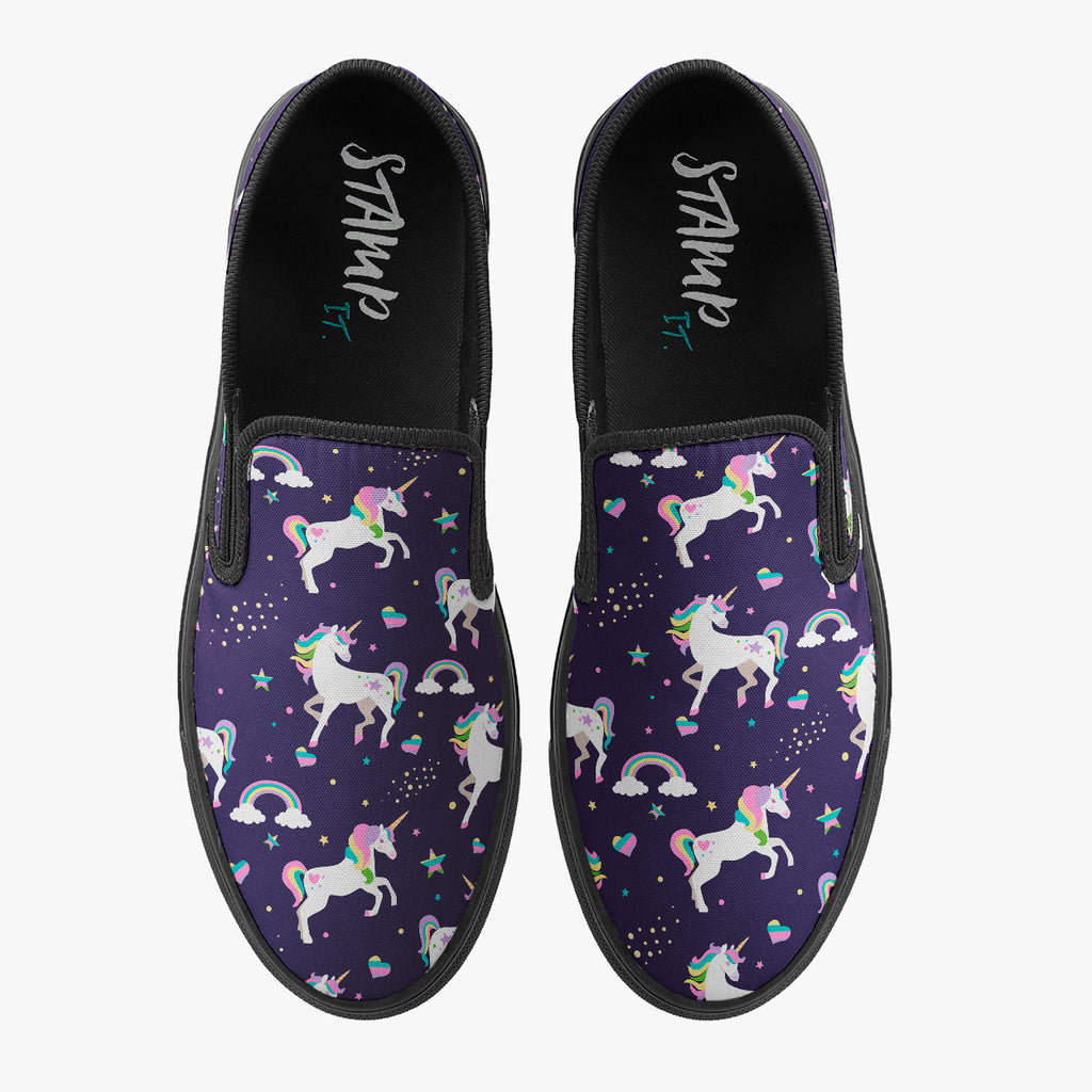 Tênis Slip On Roxo Unicórnio Estrela Coração Animais, confeccionado em lona, com cores e estampas exclusivas.