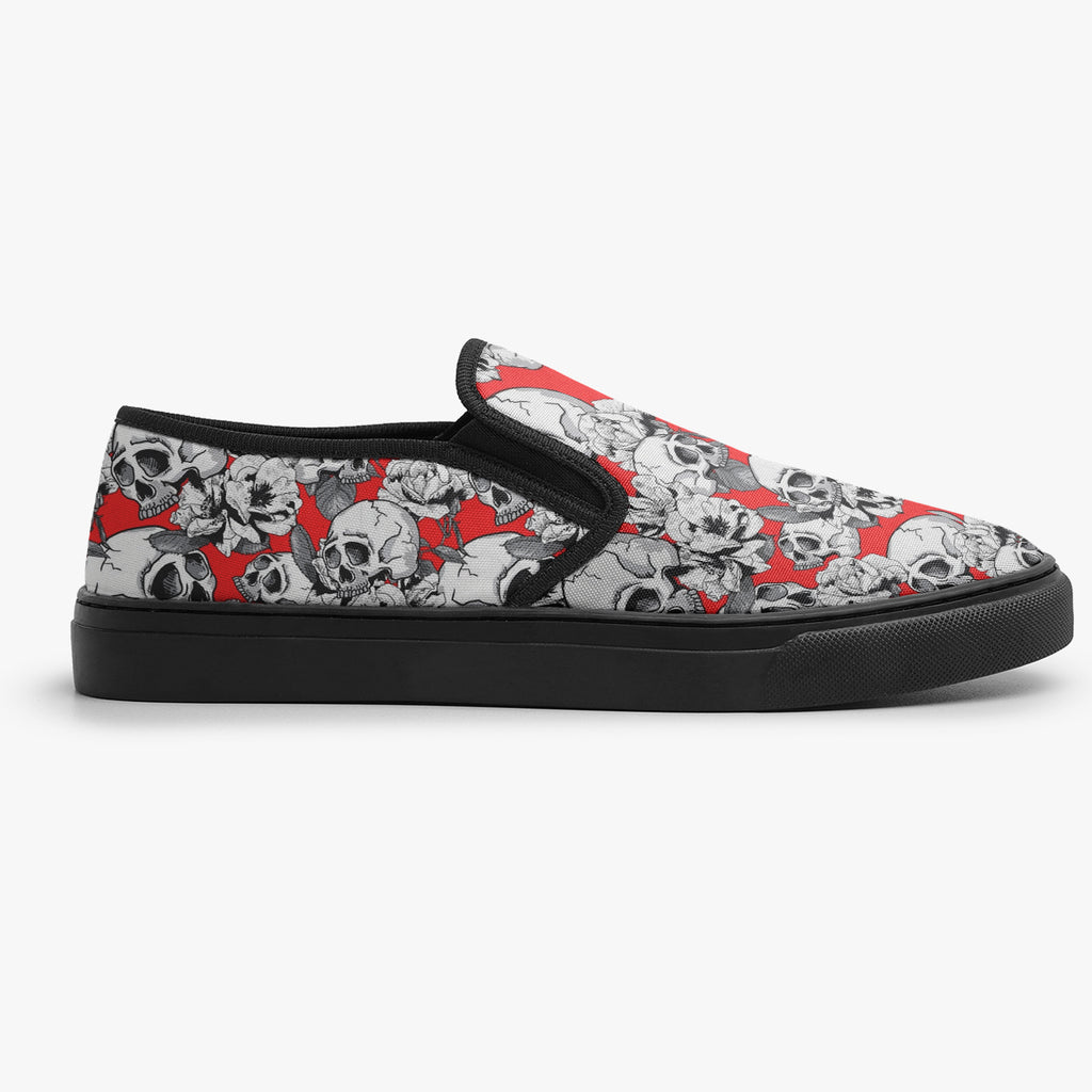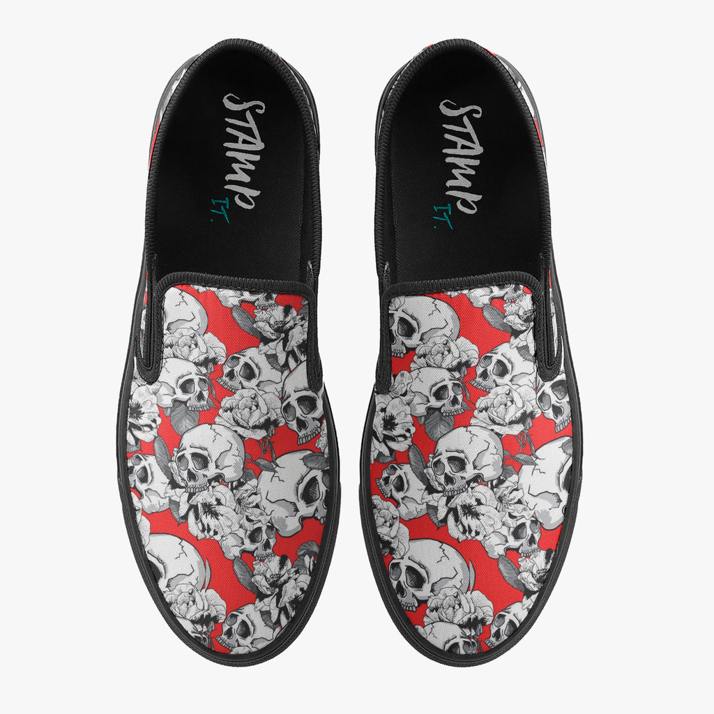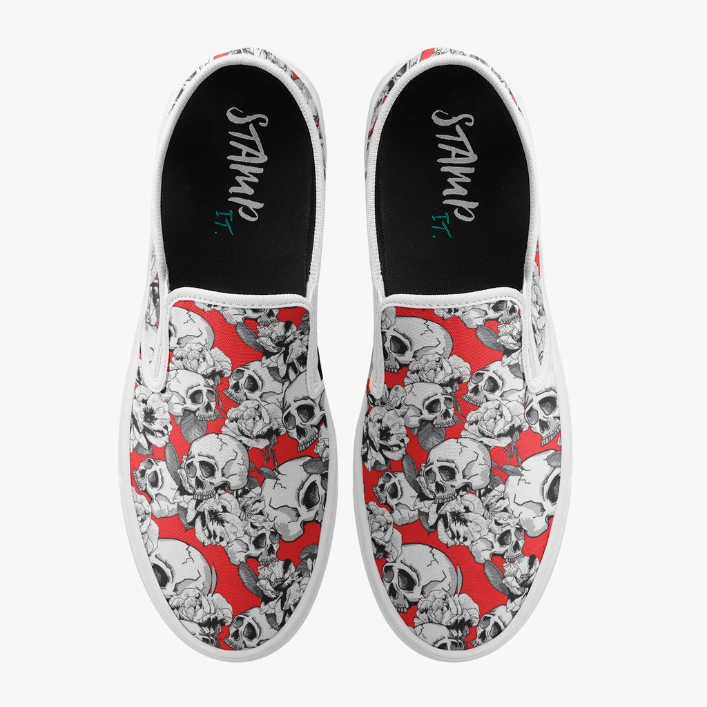 Tênis Slip On Vermelho Caveiras e flores Caveiras